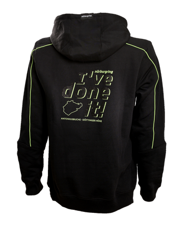 Celebrate your successful lap on the Nordschleife with the "I've done it" men's hoodie from the official Nürburgring shop. This black and green hoodie is made from a comfortable blend of 80% organic cotton and 20% polyester. The green Nürburgring logo adorns the front, while the "I've done it!" lettering on the back in a striking carbon look celebrates your triumph and achievement. Ideal for cool days at the racetrack or relaxed leisure activities.