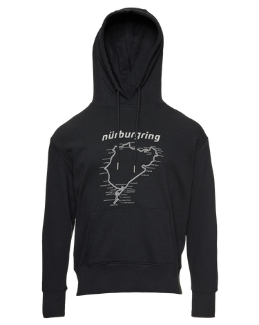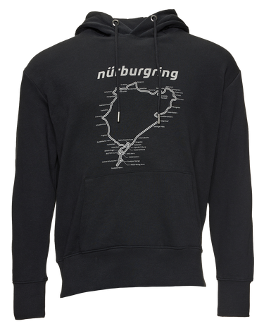 A must-have for every Nürburgring fan: the men's "Racetrack" hoodie. Optimal comfort combined with the Nürburgring silhouette and lettering on the chest. The print featuring the track layout brings the fascination of the legendary race track into your everyday life.