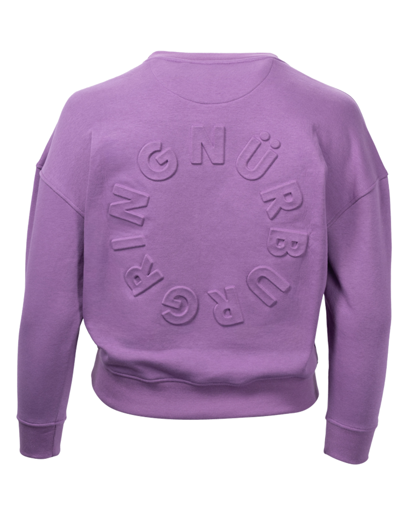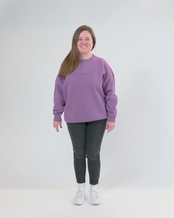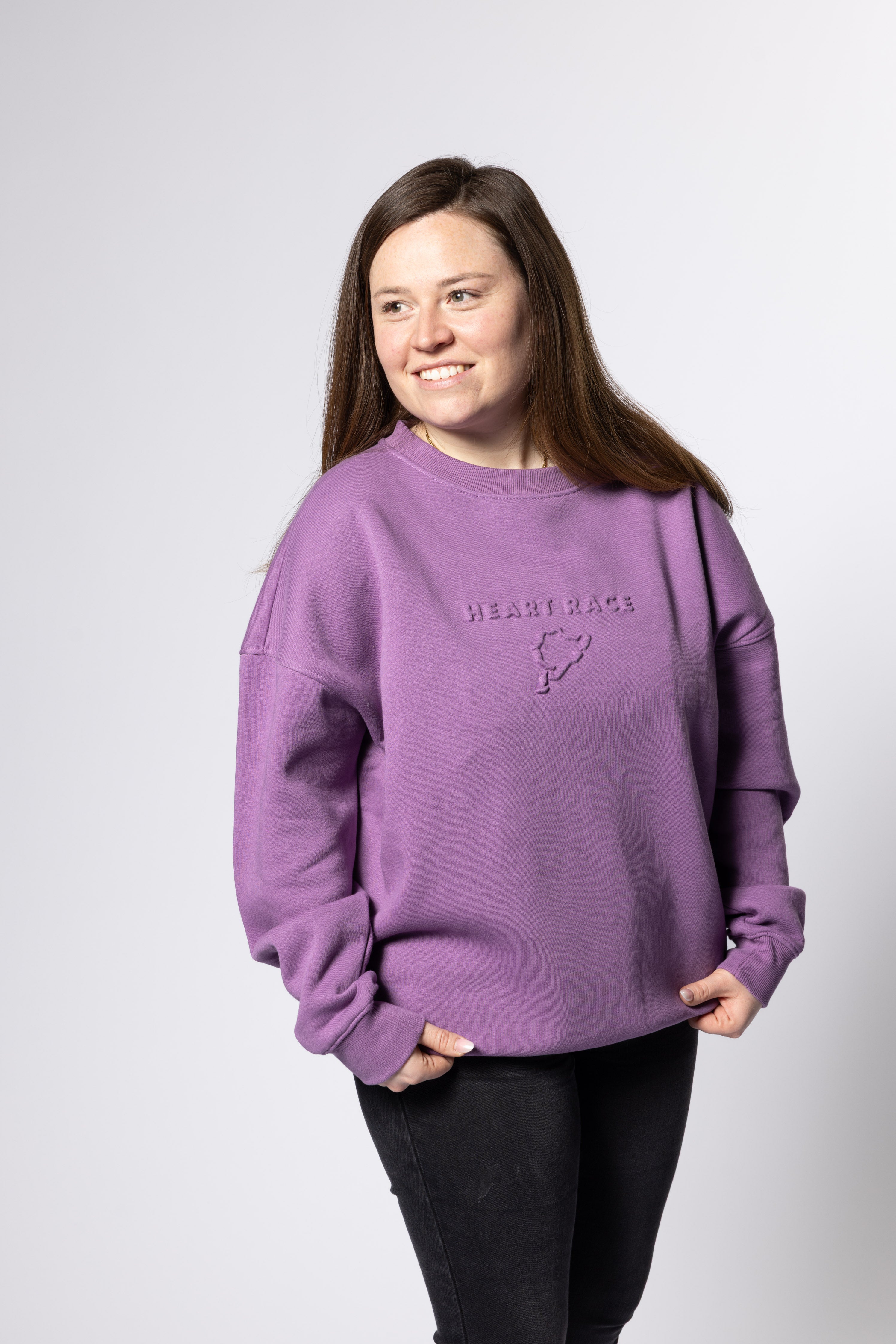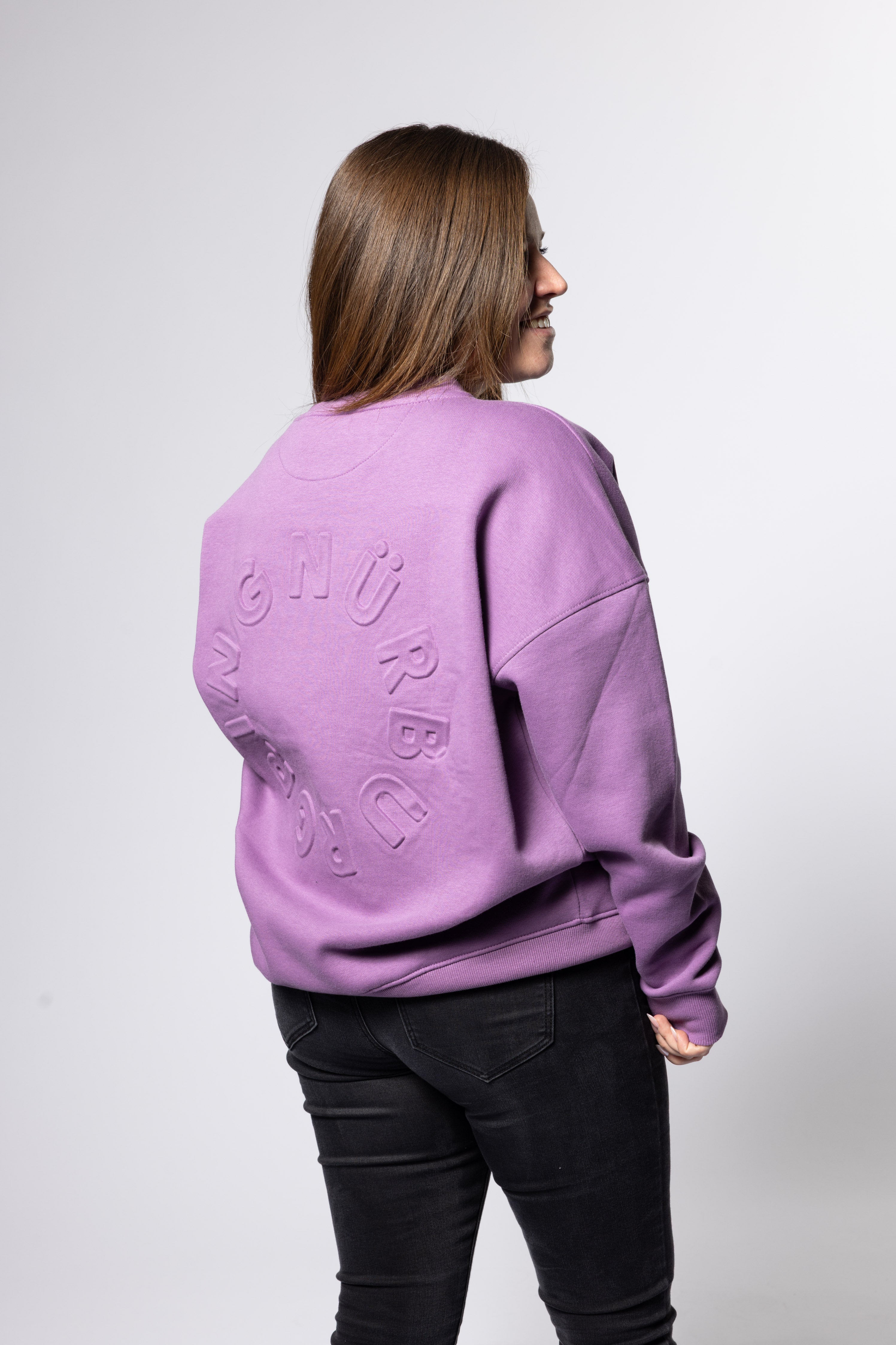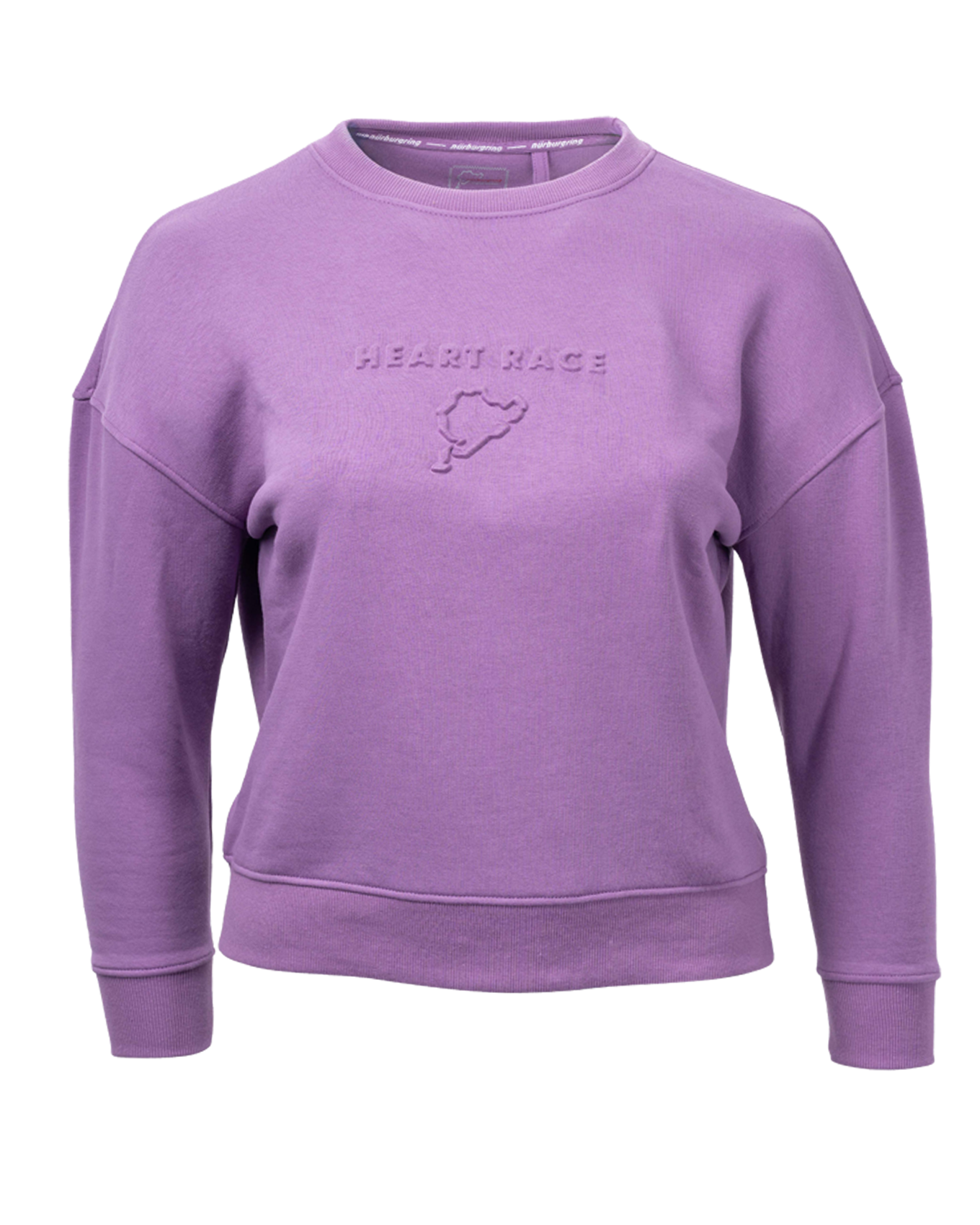 Lässiger Damen Sweater in Violet mit 3D-Druck vorne, sowie hinten. Der Druck geht mit dem Farbton über. Vorne ist der "heart race"-Schriftzug mit der Strecke und auf dem Rücken befindet sich ein "Nürburgring"-Print.