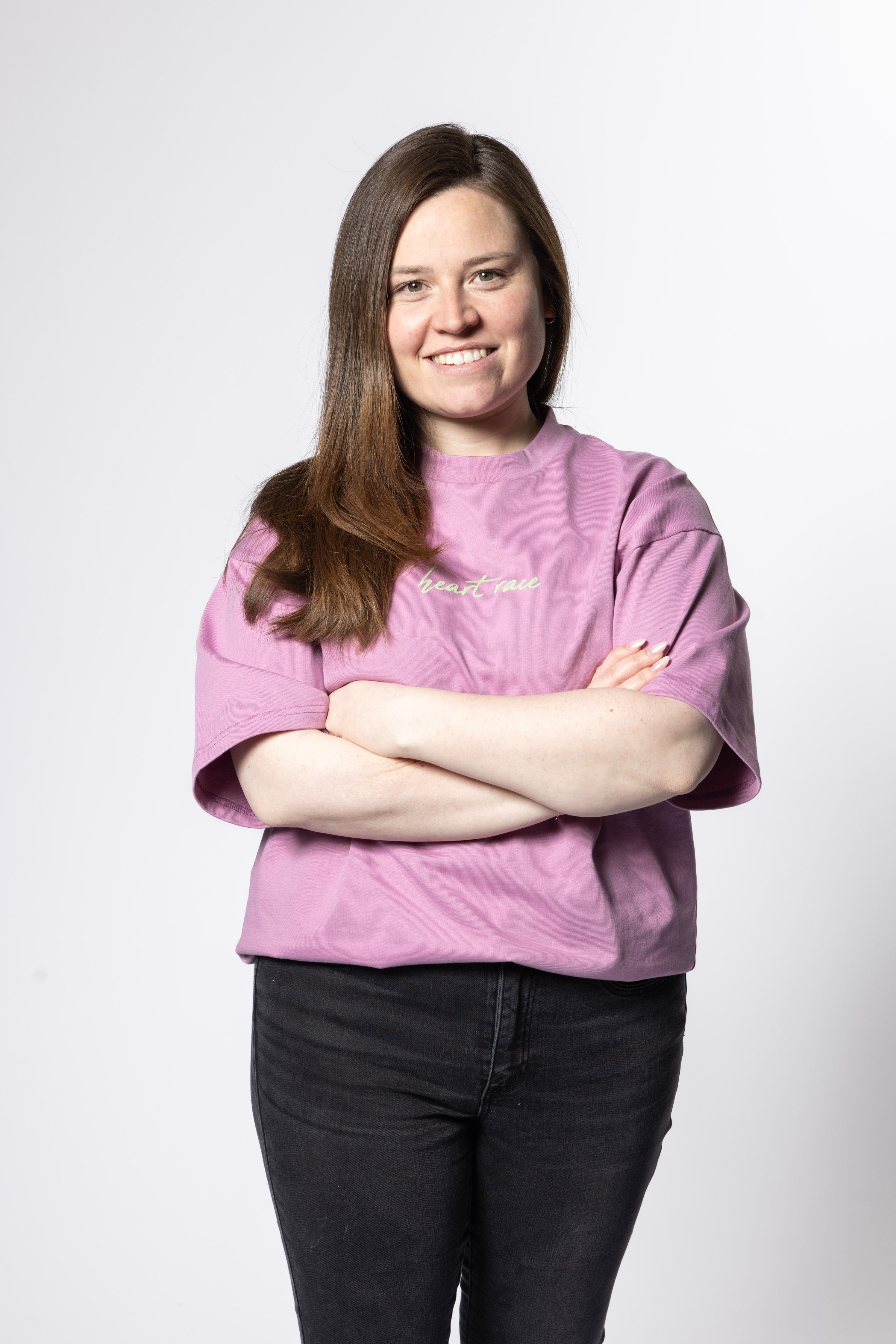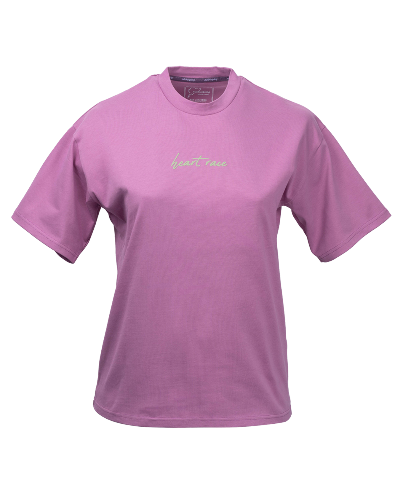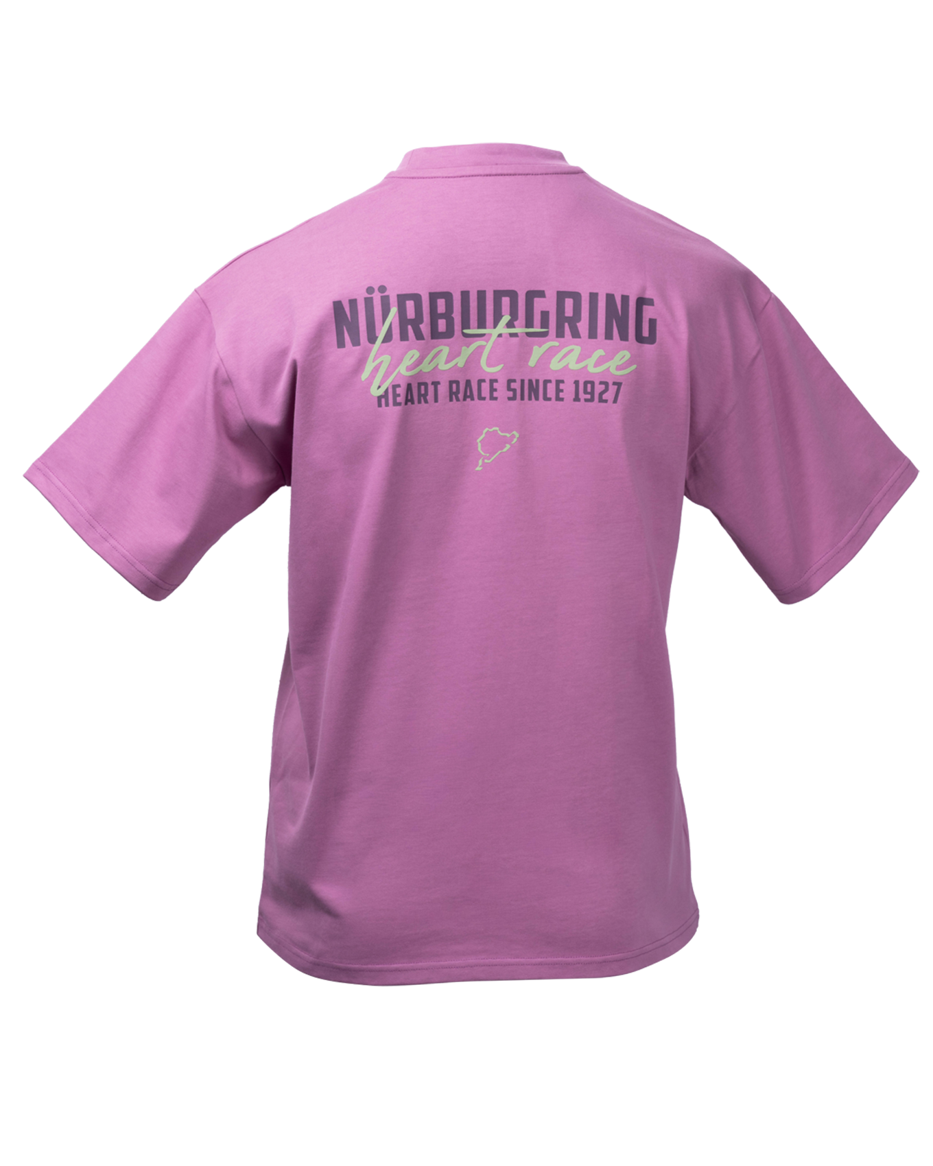 Feminin geschnittenes Damen T-Shirt in Pink mit dezentem Frontprint in hellgrün. Auf dem Rücken ist ein großer, ausdrucksstarker Rückenprint "Nürburgring - heart race".