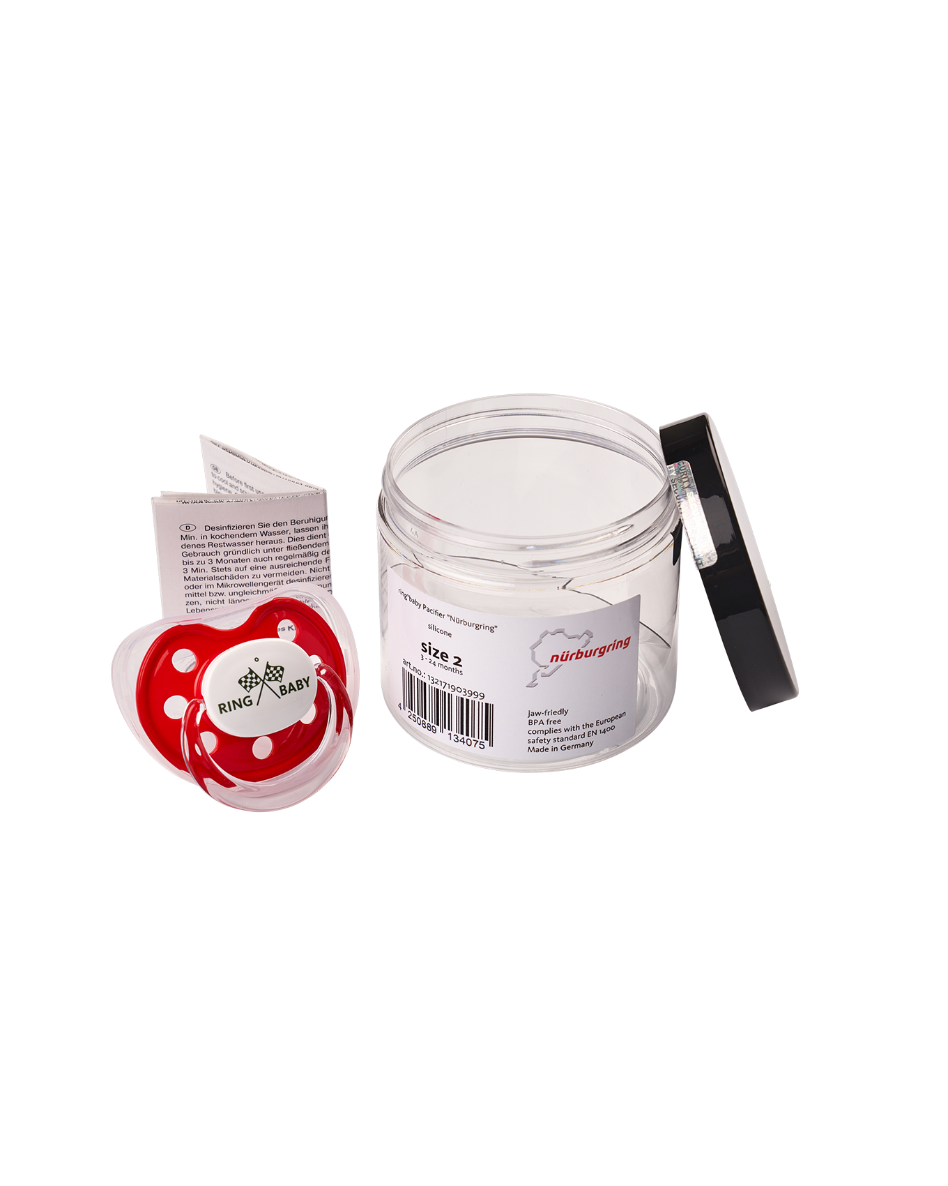 The ring°baby "Nürburgring" pacifier is the perfect accessory for little Nürburgring fans who want to stay stylish even while dreaming. Made from high-quality, BPA-free silicone, this pacifier is gentle on sensitive baby skin and provides a comfortable sucking sensation.