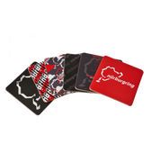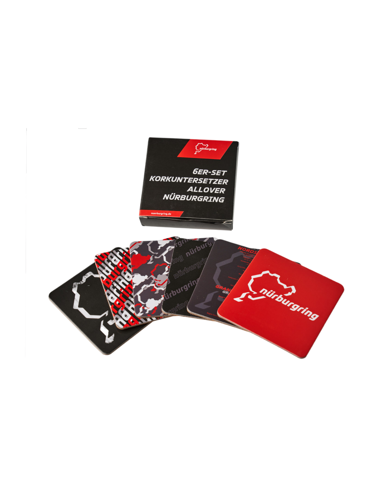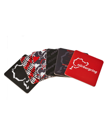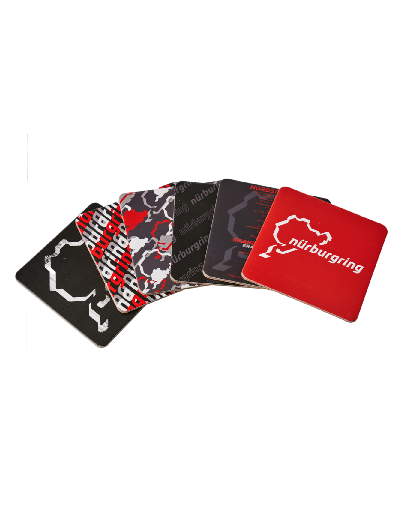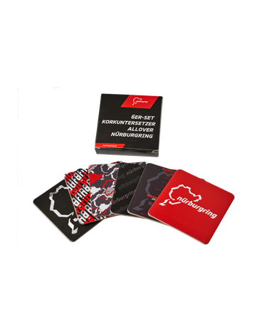Set of six cork coasters with various Nürburgring logo illustrations that should not be missing on any table