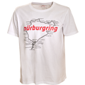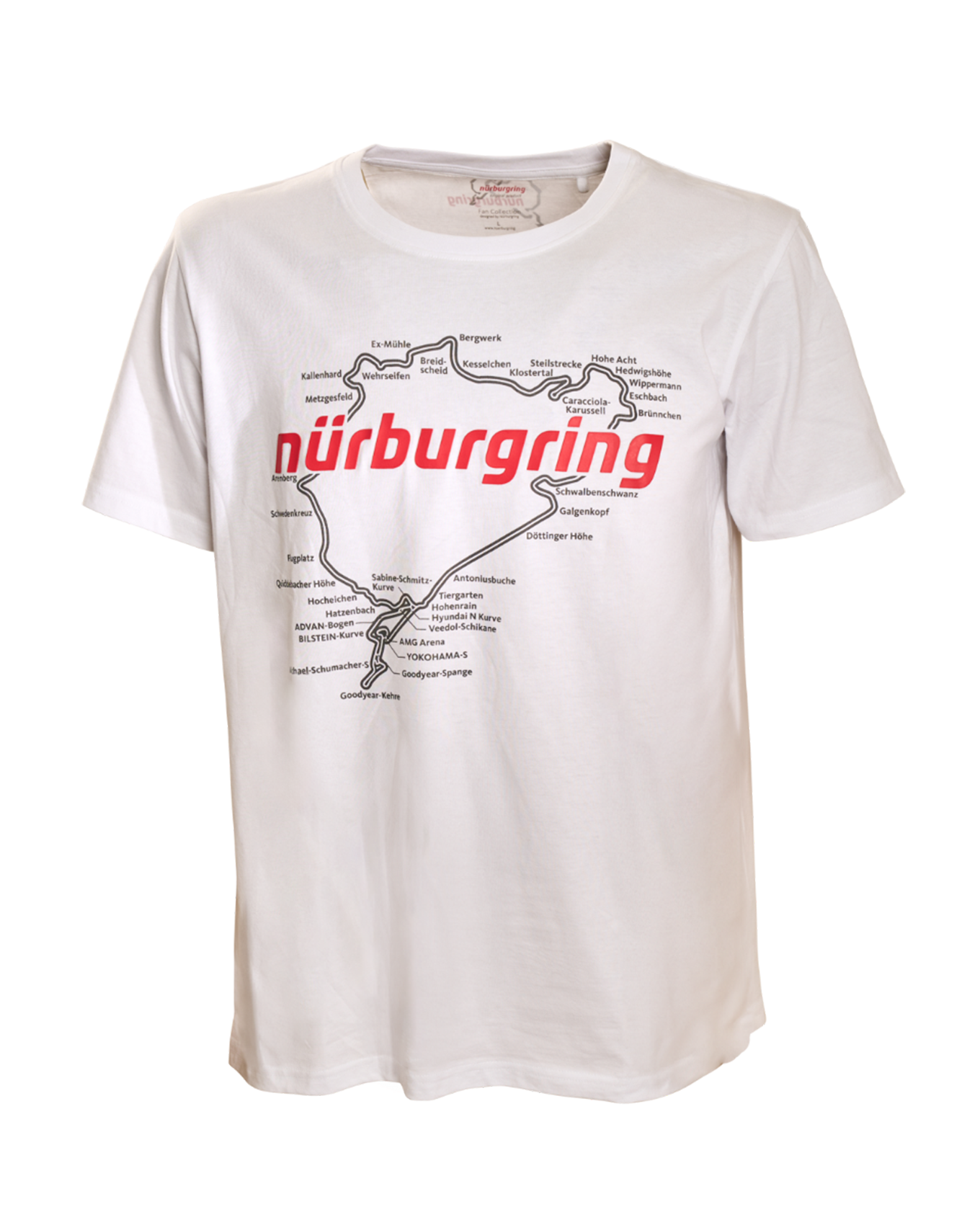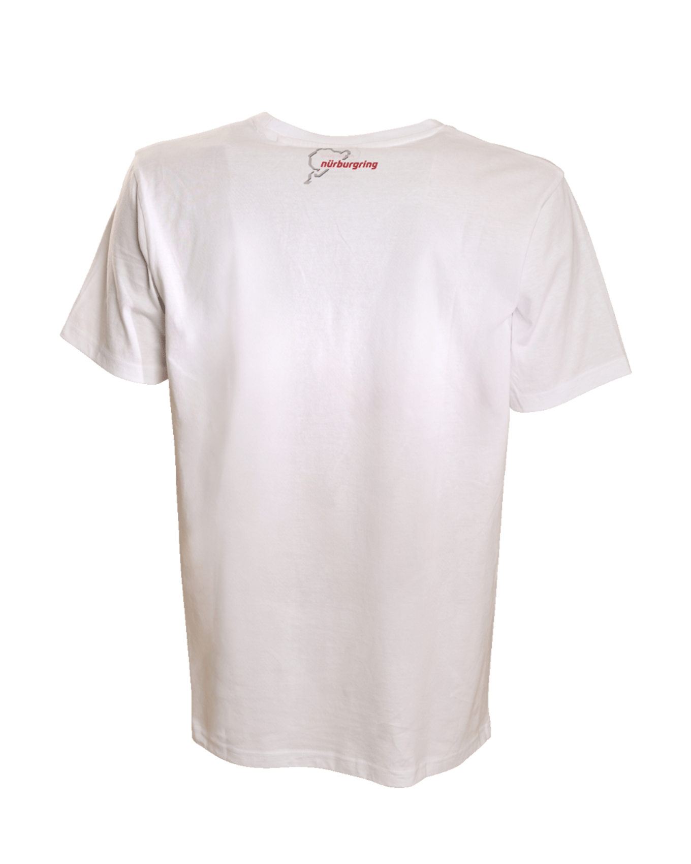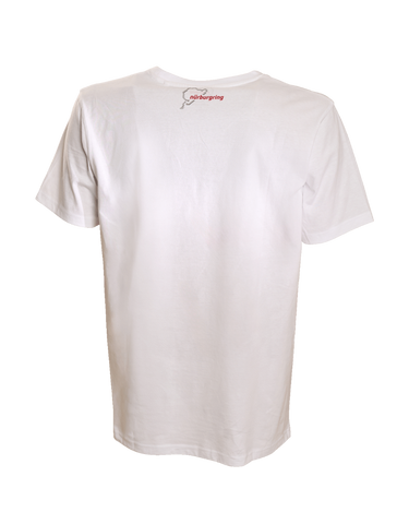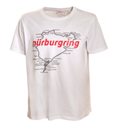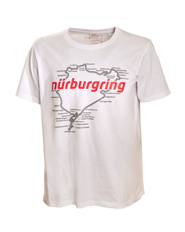 The striking Nürburgring print on a white background with black print and red lettering makes this T-shirt a must-have for all racing enthusiasts.